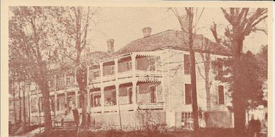 The Elder Hotel a two-story frame building was built in 1851 and burned in 1897. It 1903 the hotel was rebuilt into a lovely three story frame building overlooking the mineral spring. In all, the hotel was in operation over one hundred years. In burned in February 1984. The printing of this card was donated by James E. Cornell, Jr. of Indian Springs Georgia.